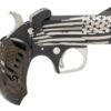 Bond Arms’ “Old Glory” features a full Cerakote finish with the American Flag laser engraved across the barrel and frame. The extended black ash grips are custom engraved with the American Flag. The Old Glory has a 3.5″ barrel chambered in .45LC/.410 with a blade front sight and fixed rear sight. The Old Glory has a stainless steel double-barrel and frame, and is compatible with all standard Bond Arms barrels. It has an automatic spent casing extractor, patented rebounding hammer, retracting firing pin, crossbolt safety, and a spring-loaded, cammed locking lever. Old Glory Packages include an additional barrel and a holster. Old Glory Package 2 includes a second Cerakoted barrel in 357/38 and a Bond Arms black leather driving holster.