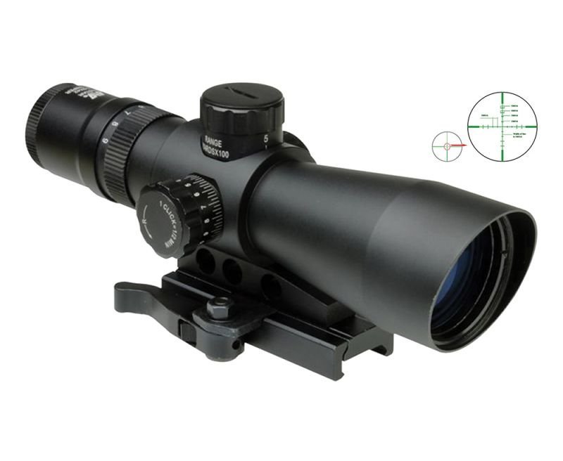 •Open target turrets •Full multi-coated lenses w/green lens coating •Built-in angle cut sunshade •Quick focus eyepiece •Bullet drop compensator calibrated for .5.56 cartridge w/55 grain FMJ bullet •Reticles illuminate in blue or green w/multiple brightness setting •Integrated locking quick release Weaver Style/Picatinny lever •1/2 MOA •Black finish •Includes lens covers & extra battery •Power: 3-9×42 •P4 Sniper Reticle